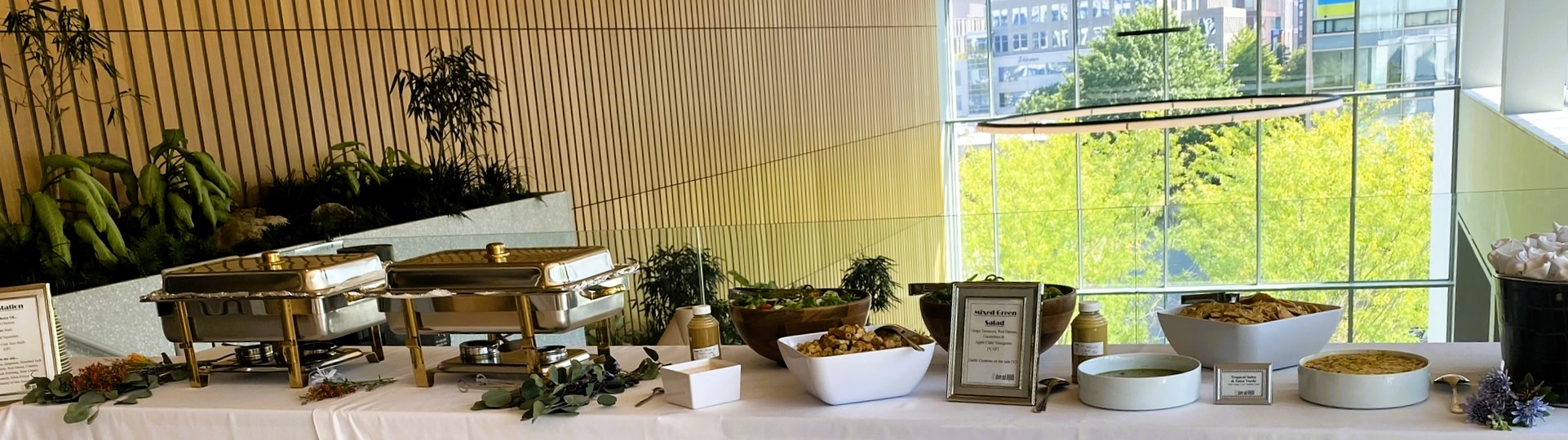 We offer a variety of catering options for all day conferences, including a fully staffed experience with all food prepared on site, a delivery and set-up option with a few staff staying on site to maintain and clean throughout the day or a delivery and set-up option with no staff remaining.